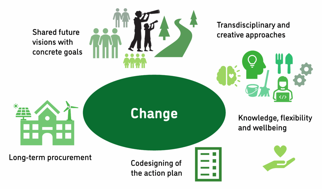 In educational practice, these competences are expressed through addressing change in schools and universities. For practitioners, it is often easier to focus on concrete ways to improve sustainability and reduce environmental impact within their own institutions, rather than relying on abstract visions. They are interested in what concrete options are available to them and what specific changes are needed. Uncertainty and eco-anxiety can make the process burdensome.