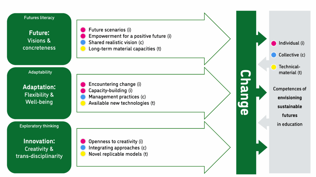 In educational practice, these competences are expressed through addressing change in schools and universities. For practitioners, it is often easier to focus on concrete ways to improve sustainability and reduce environmental impact within their own institutions, rather than relying on abstract visions. They are interested in what concrete options are available to them and what specific changes are needed. Uncertainty and eco-anxiety can make the process burdensome.