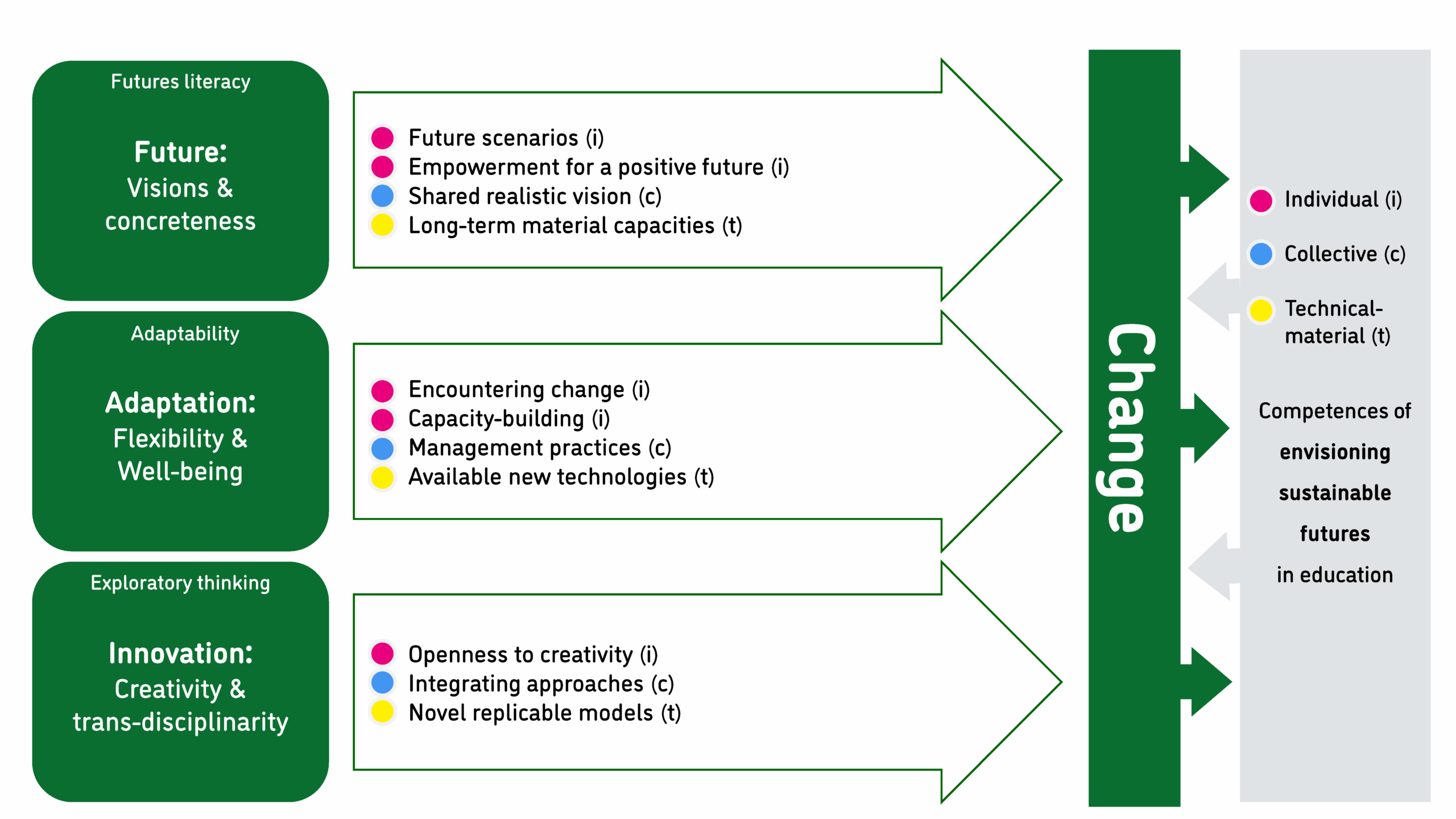 The main perspectives in promoting change in educational settings are future, adaptation and innovation, as described above. Different dimensions of competences are simultaneously needed for tackling this change, and we should ponder how we can promote these different competences:
