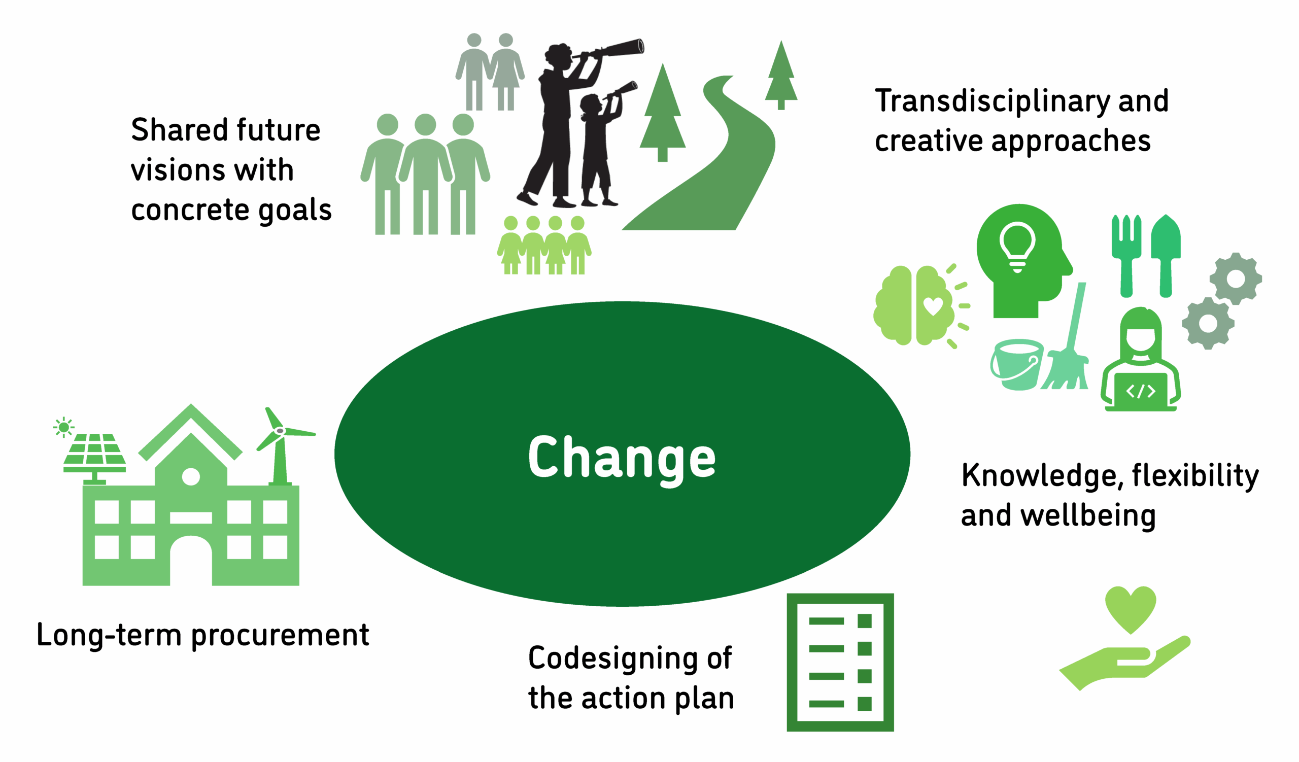 The ability to create a shared vision depends on institutional structures and a cultural-cognitive atmosphere that supports development work. Regulations, such as collective labour contracts, can sometimes hinder flexible cooperation or limit opportunities for technical development. Transdisciplinary networks (including teachers, students, staff, families, service providers, municipalities, local associations, and businesses) create possibilities to integrate competences from diverse backgrounds into something new. Turning plans into written norms and strategies helps schools and universities, along with their stakeholders, work toward a common goal.