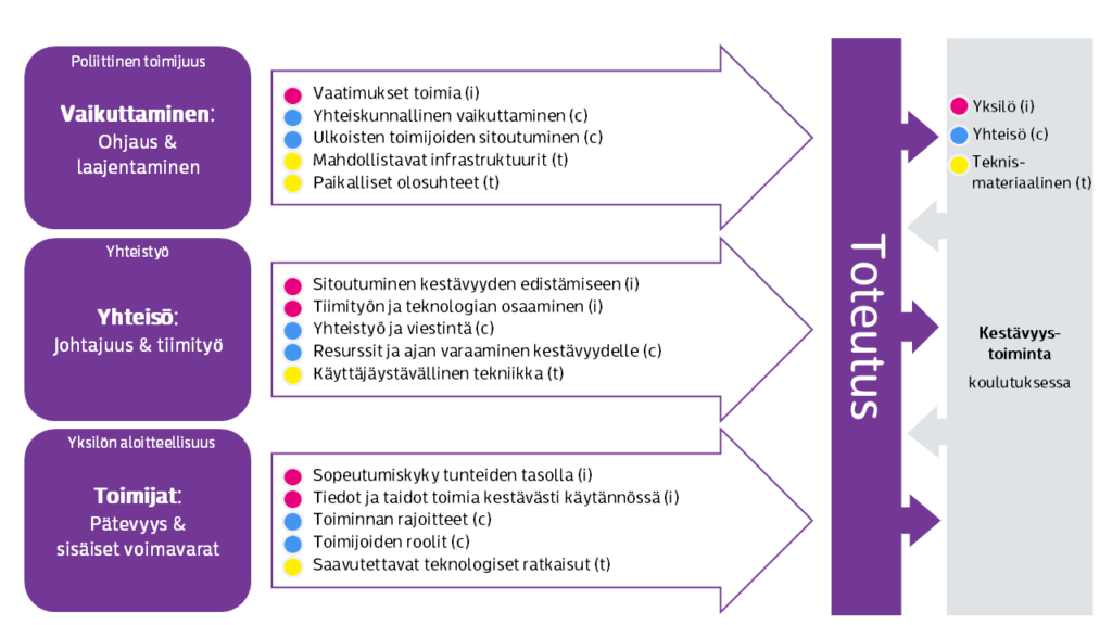 Kestävyystavoitteiden toteutus mahdollistuu hallinnon tukemana ja sitoutuneiden johtajien, henkilökunnan ja oppilaiden työn kautta. Olemassa oleva toimintasuunnitelma tukee tavoitteiden toteuttamista. Henkilökohtaisen osaamisen vahvistaminen on tärkeää, esimerkkinä käyttökoulutukset teknisille laitteille. Avautuminen yhteiskuntaan ja yhteistyö ulkopuolisten toimijoiden kanssa lisää vaikuttavuutta.