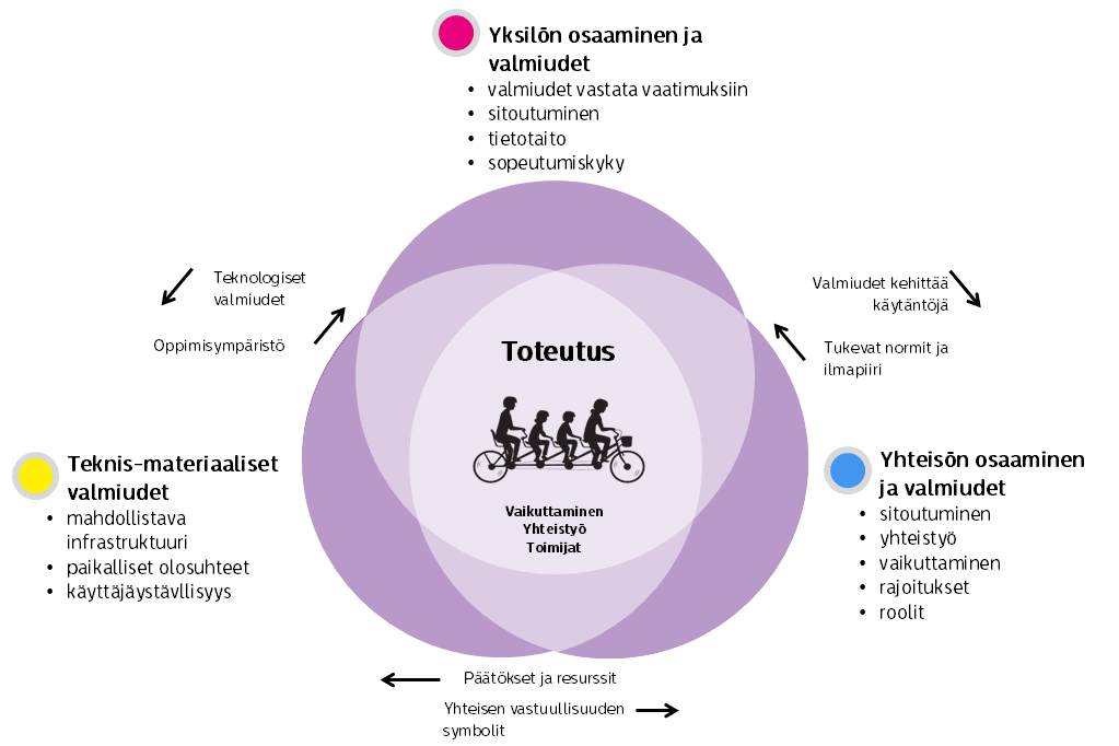 Toteutukseen liittyvät yksilön ja yhteisön osaaminen ja valmiudet sekä teknis-materiaaliset valmiudet kietoutuvat tiukasti toisiinsa.