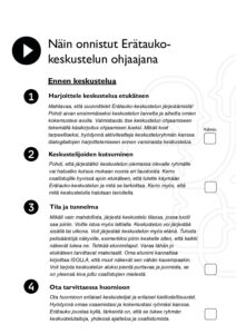 Erätauko on menetelmä, joka tukee dialogi- ja keskustelutaitojen oppimista. Erätauon avulla voi harjoitella kuuntelemista, puhumista, asioiden puheeksi ottamista ja keskustelun ohjaamista. Valmistaudu tämän tukimateriaalin avulla keskusteluun, luota itseesi ja onnistut.