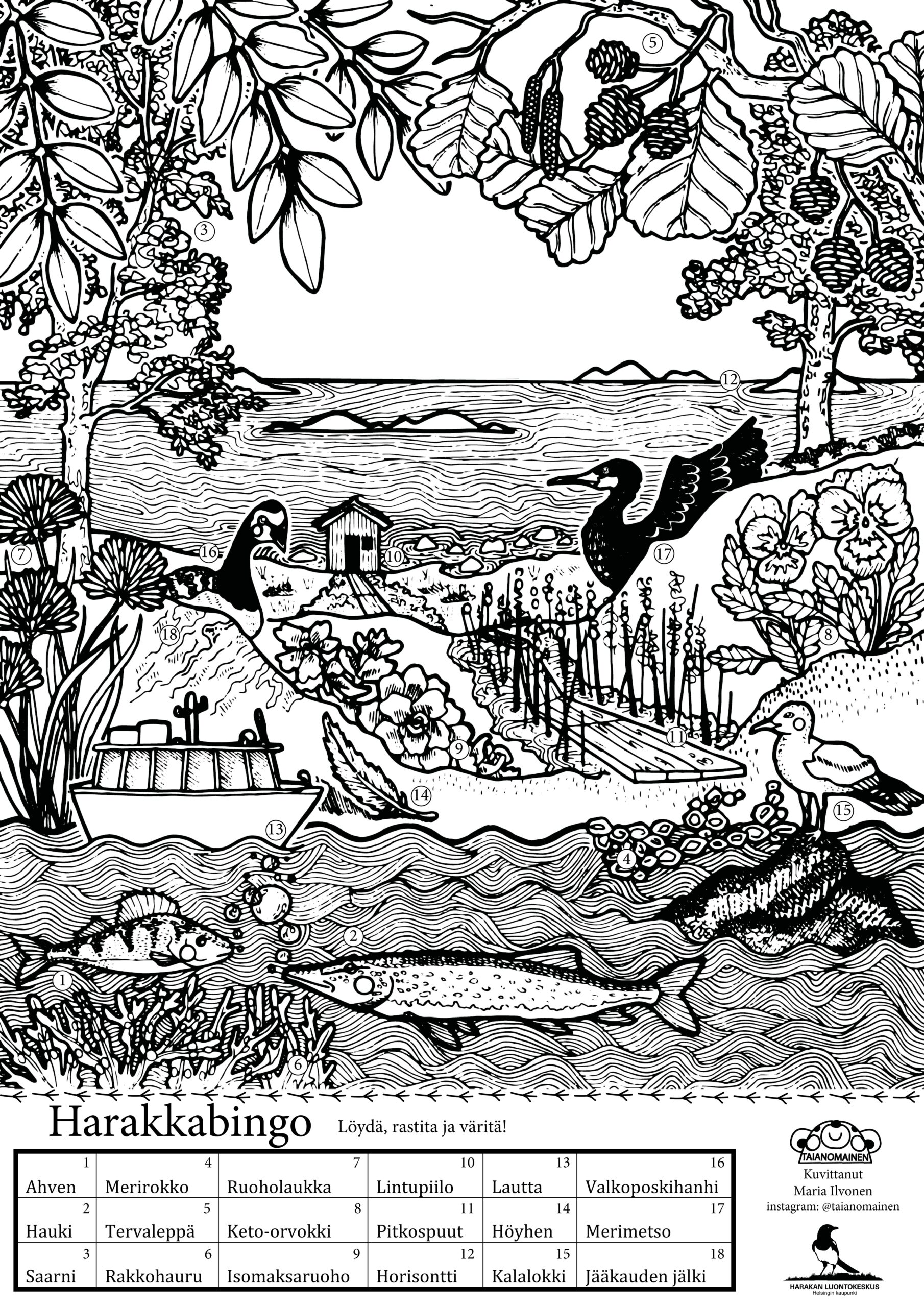 Tutustu Harakan saareen värityskuvan avulla ennen saarivierailua tai etsi lajeja ja kohteita bingoamalla retkellä. Materiaali sopii saariseikkailuryhmille ennakkotehtävänä.
