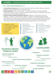 Taulujen alaosaan on listattu myös yleisiä aihealueita, teemoja ja käsitteitä, joita kunkin vuosiluokan aikana pidetään esillä. Taulut voi tulostaa A3-koossa luokan tai opettajanhuoneen seinälle, tai tallentaa .pdf-tiedostona omalle koneelle.